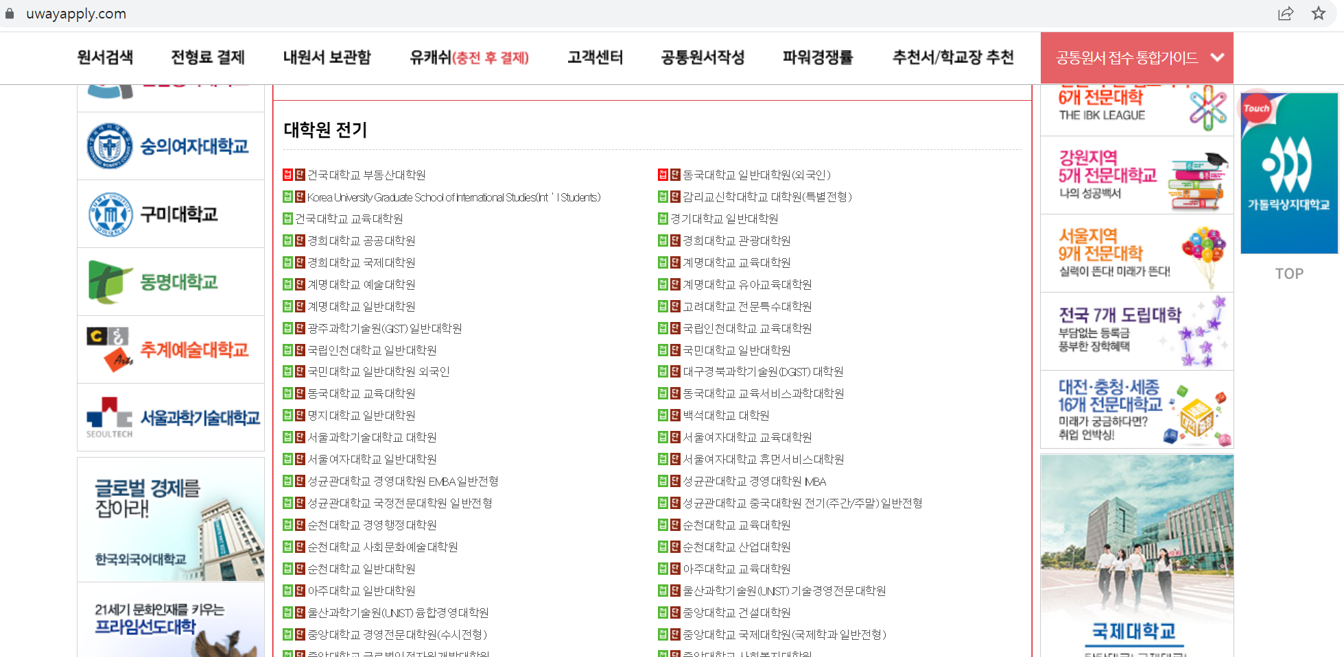 원서 접수는 유웨어플라이에서 하는 경우도 있고, 각 학교 개별 웹 페이지에서 진행하는 경우도 있습니다.
